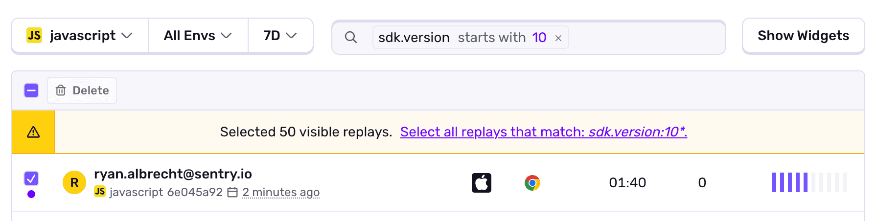 Alternatively, you can delete all replays that match a search query by clicking "Select all" at the top of the results list. This selects every replay matching the current filters, not just those visible on the page.